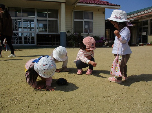 その間に、園庭をお散歩するカメに夢中のこどもたちです。