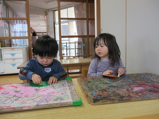 画用紙に、クレヨンで描いていきます。