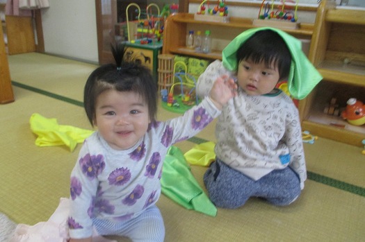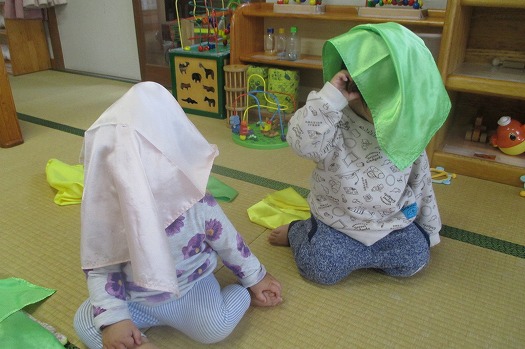 大人が「ばあっ」と顔を出した時も、にこっと笑うこどもたちです。