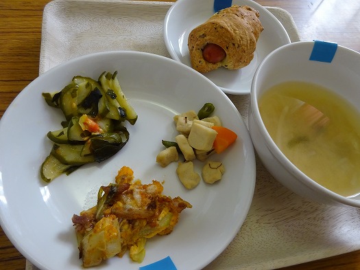 2022年05月16日 給食室(5月16日の給食、おやつ) 給食室 昼食 ・ごはん ・とん平焼き ・高野豆腐の煮物 ・きゅうりとトマトの和え物 ・もやしのみそ汁 おやつ ・くるくるウインナー ・牛乳 『とん平焼き』は豚肉とキャベツを塩こしょうで炒めた後、 鉄板に卵と一緒に入れて焼いています。 お好みソース味の人気のメニューです。 おたのしみおやつは『くるくるウインナー』でした。 見た目もおもしろく、食べ応えのあるおやつです。 一覧へ戻る