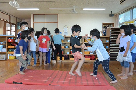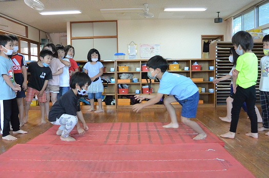 2022年05月18日 お相撲 5歳児 そら コロナ禍でクラス単位の分散保育を心がけているため、園庭の使用も時間が決められています。 「はっけよーい!のこった!」室内でもストレス発散・・・ 相手をマットの外に出すか、マットに転がせば勝ち。 繰り返しの取り組みの中で、どうすれば勝てるか自然と身につけているようで、 体格や男女に関係なく、勝ち負けが入れ替わります。 一覧へ戻る