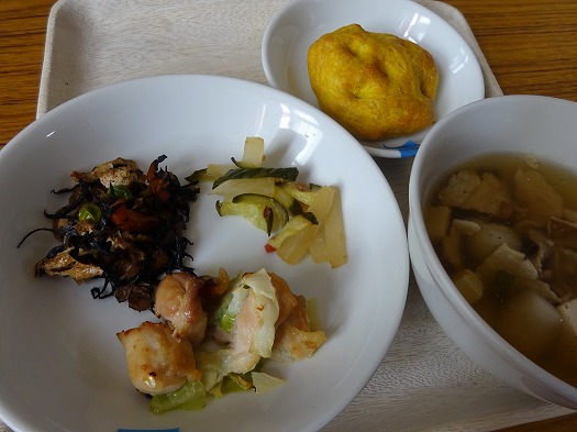 2022年05月24日 給食室(5月23日の給食、おやつ) 給食室 昼食 ・ごはん ・鶏ちゃん ・ひじきの煮物 ・大根の梅ドレ和え ・沢煮椀 おやつ ・パンプキンフォカッチャ ・牛乳 『鶏ちゃん』は岐阜県の郷土料理です。 鶏肉をみそやしょうゆベースのたれに漬け込み、季節の野菜と炒めます。 保育園ではキャベツと一緒に焼き上げました。 にんにくとしょうがが効いていて、食欲をそそる一品です。 これからの季節、夏野菜のなすやピーマンと一緒に炒めてもおいしそうですね。 おたのしみおやつは『パンプキンフォカッチャ』でした。 一覧へ戻る