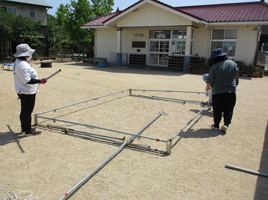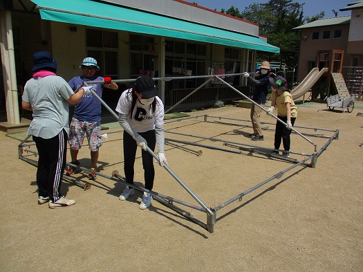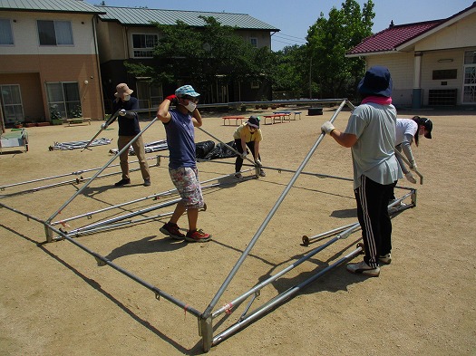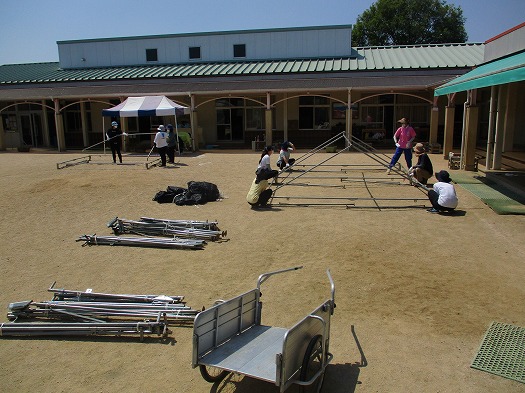 こどもたちが昼寝をしている間に、運動会テントや遮光ネットを運び出して、さ~みんなで頑張るぞ