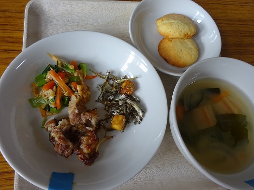 2022年06月07日 給食室(6月6日の給食、おやつ) 給食室 昼食 ・ごはん ・豚肉のしょうが焼き ・さつま芋と煮干しのごまがらめ ・えのき納豆 ・麩のみそ汁 おやつ ・甘夏クッキー ・牛乳 『さつま芋と煮干しのごまがらめ』はカミカミメニューです。 さつまいもと煮干しをさっと揚げ、砂糖醬油で味つけしています。 おやつ感覚で食べられるのか、こどもたちに人気でした。 おたのしみおやつは『甘夏クッキー』でした。 甘夏は地域の方からのいただきものです。 ジャムにしてから、クッキー生地に混ぜ込みました。 一覧へ戻る
