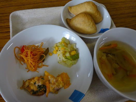2022年06月08日 給食室(6月7日の給食、おやつ) 給食室 昼食 ・食パン ・鶏肉のピカタ ・スパゲティケチャップ炒め ・コーンサラダ ・ジュリアンスープ おやつ ・いなり寿司 『ピカタ』はイタリア発祥の料理です。 下味をつけた豚・鶏の薄切り肉に小麦粉をつけた後、卵にくぐらせて焼きます。 保育園では卵に粉チーズを混ぜました。 『コーンサラダ』は手作りの青じそドレッシングで味つけしています。 全体的に彩りがよく、こどもたちの食も進んだようです。 おやつは『いなり寿司』でした。 一覧へ戻る
