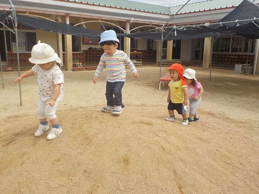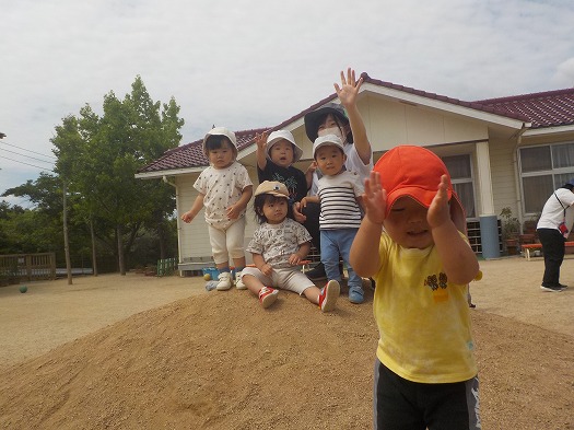 園庭にある土の山にのぼりました。土の斜面を自分の足でしっかりのぼって、ゆっくりおりてみたり、少し早歩きでおりてみたりと上り下りを楽しんでいます。