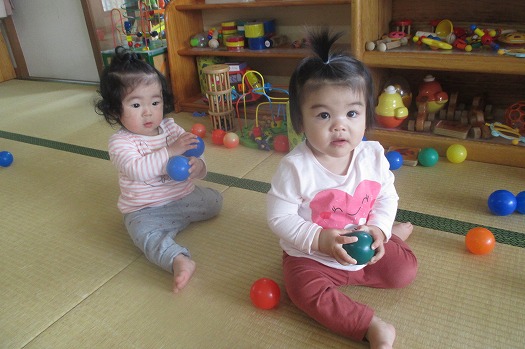 ボールを使って遊びました。大きな袋から小さなボールをたくさん出すと、はいはいやずりばいで取りに行き、手でつかんでいます。