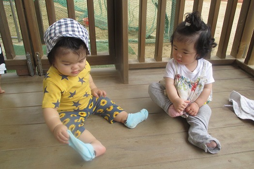 保育者が靴下を持ちながら、「ぬぎぬぎ」と言うと、こどもたちも真似をします。自分の靴下に手を伸ばすと、「うーん」と言いながら、脱げるまで力を入れる。