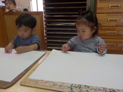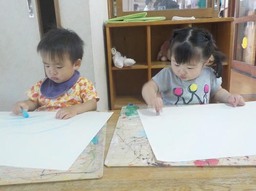 2022年06月17日 クレヨンで描くの楽しいな 1歳児 ゆき 描画をしました。クレヨンを指でつまんだり手全体で持ったりして、思いおもいに画用紙に線や点を描いていきます。 友だちが描いている様子も気になるようで、近くの子が点を描いていたら同じように点を打つ子もおり、一緒のことをしたい気持ちも強くなっています。 それぞれの描き方、表現の仕方を声かけを通して認めています。 一覧へ戻る