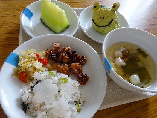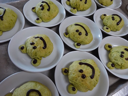 ずらっと並ぶカエルをみて、「かわいい」「どこからたべようかな」と