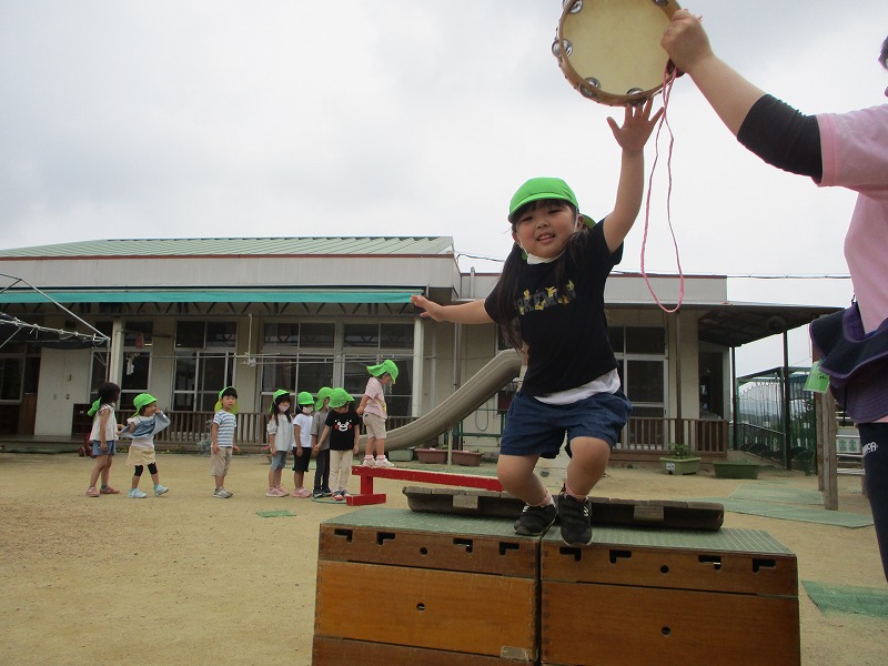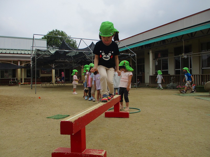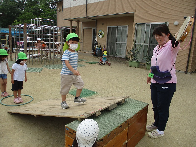 2022年06月22日 サーキット 4歳児 ほし 園庭に斜面台と平均台を出し、プチサーキットをしました。 平均台から落ちないように慎重に渡り、斜面台へ 斜面台は初めてだったのですが、こどもたちには低かったようでスムーズに登っていました。 最後はジャンプでタンバリンにタッチをしゴールです。 「次は斜面台をもう少し高くしてみようかな」と伝えると嬉しそうな表情をしていました。 一覧へ戻る