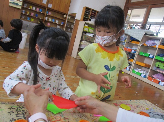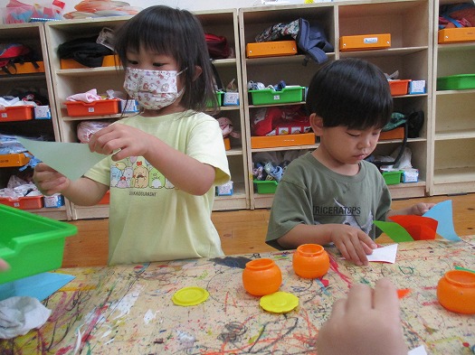 七夕の飾りづくりに向けて、のりをつかって飾りをつくりました