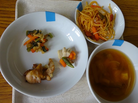 2022年06月29日 給食室(6月28日の給食、おやつ) 給食室 昼食 ・ごはん ・鶏肉のねぎ焼き ・高野豆腐の煮物 ・はりはり漬け ・なめこの赤だし おやつ ・ナポリタン 「はりはり漬け」は花切大根(切干大根のようなものです)と にんじん・小松菜が入っています。 酸味の効いた味付けで、ごま油も入っているので さっぱりとこどもたちも食べやすかったようです。 おたのしみおやつは『ナポリタン』でした。 ウスターソースを隠し味に入れると味がひきしまりますよ。 一覧へ戻る