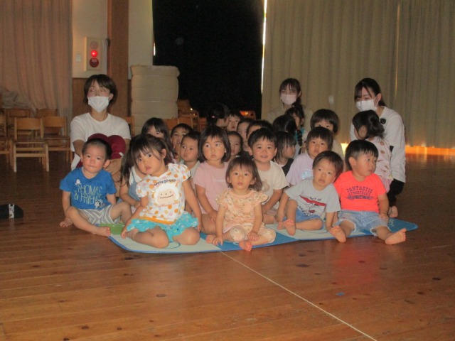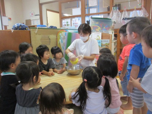 2022年07月01日 楽しいこといっぱい 2歳児 にじ そうめん瓜をむいてみたり、ブラックシアターを見たりと楽しいことがたくさんありました。 あまり見ることのないそうめん瓜に「なにこれ」と身を乗り出してのぞき込むんでいました。なかなか嗅ぐ機会のない皮の匂いも嗅ぎ、「サツマイモのかおり」と何故かサツマイモの匂いがしました。 ブラックシアターでは織姫と彦星の話を聞いたり、七夕のうたを歌ったりしま、七夕の雰囲気を味わいました。 一覧へ戻る