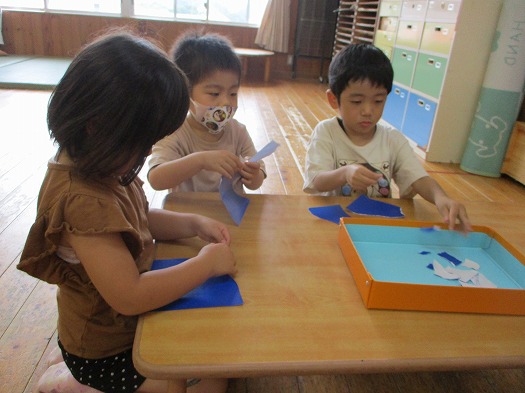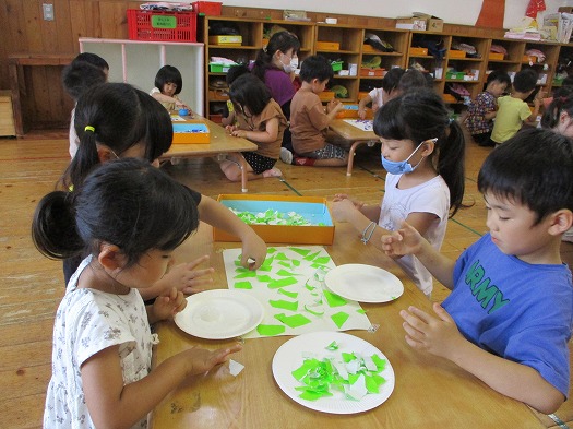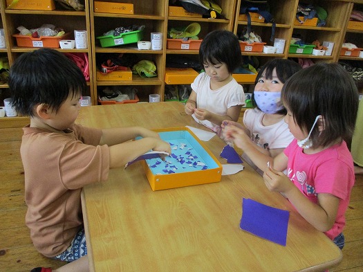 白いところがないようにぺたぺたと折り紙を貼り、完成するとグループのみんなで嬉しそうに保育者にみせていました。