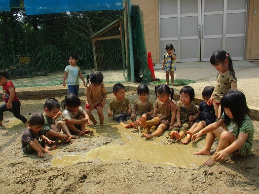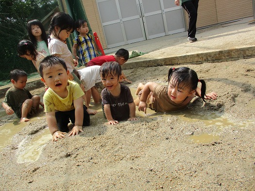 2022年07月08日 どろんこ 2歳児 にじ 泥に慣れて、全身泥まみれになる子が増えました。 こどもたちになりに、どうやったら泥をより感じられるか、 寝転がってみたり、身体に泥をつけてみたりして ダイナミックに遊んでいます。 一覧へ戻る