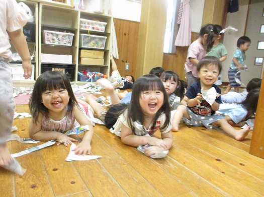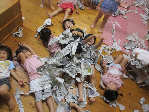 ビリビリにちぎって布団や雨に見立てて、楽しんでいます。