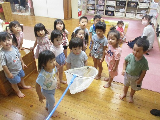 虫取り網で捕まえると、興味を示してのぞき込んでいます。