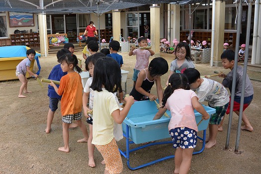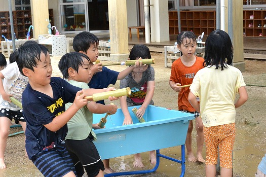 われ先にと水鉄砲に水をため、夢中で噴射するこどもたち!