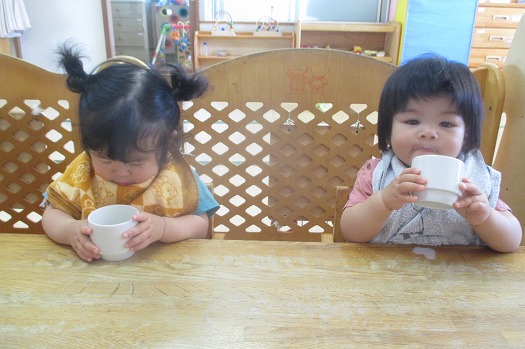 2022年08月01日 自分で持てるね 0歳児 はな ご飯やおやつ前にお茶を飲んでいます。その時に、自分でコップを持って飲むことができるようになりました。保育者が「両手で持とうね」と伝えたり、持ち方を見せたりすると、重たい陶器のコップですが、上手に持ちます。 一覧へ戻る