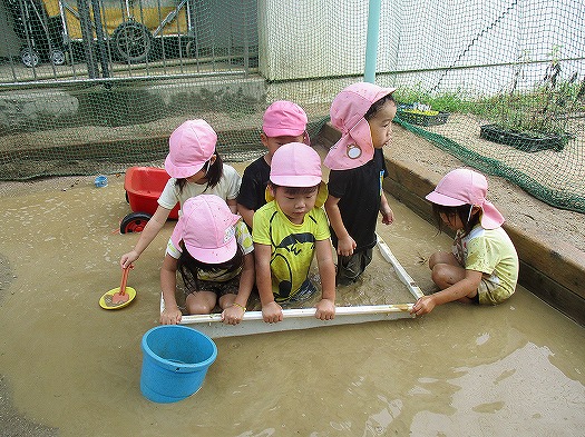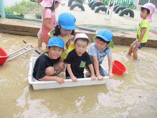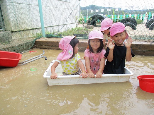 そうだ、せっかくこんなにも砂場に水が溜まっているんだからと思いタライを用意して浮かべました