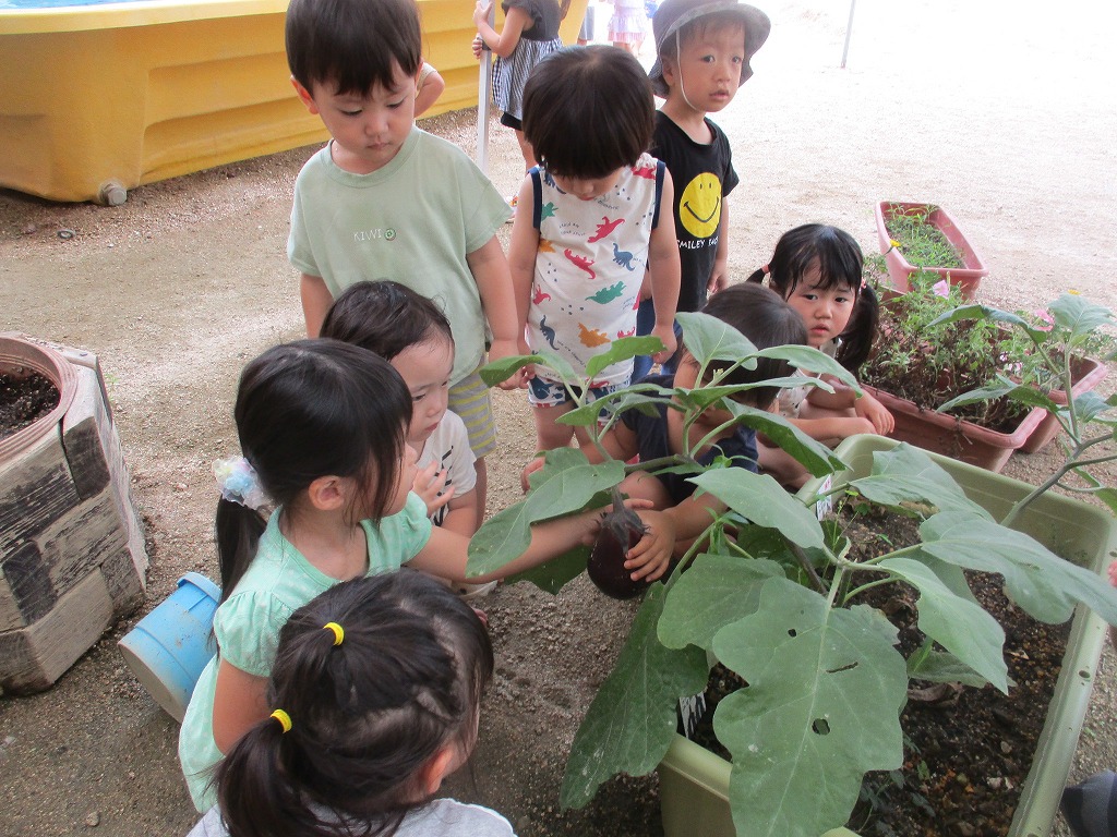 2022年08月25日 なすの収穫 2歳児 にじ にじ組で植えたなすを収穫しました。 「おおきい」と見たり触ってみたりしていたこどもたち。 収穫すると「やったー」「とれたー」と喜んでいました。 一覧へ戻る