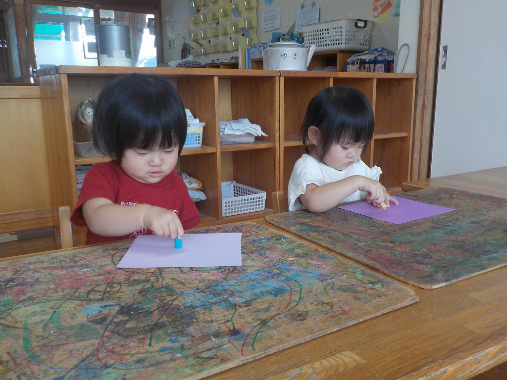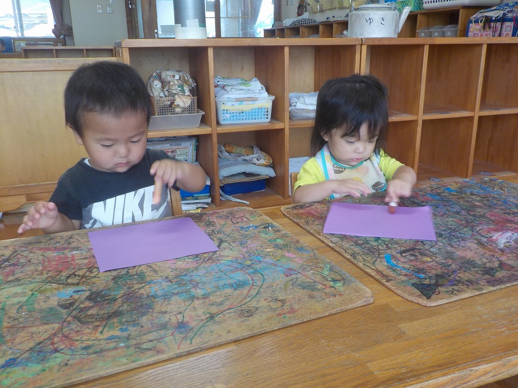 画用紙にクレヨンで描き、ぶどうの製作をしました。「クレヨンでかきかきしようね」と声をかけると嬉しそうに椅子に座り、線や点を描いています。