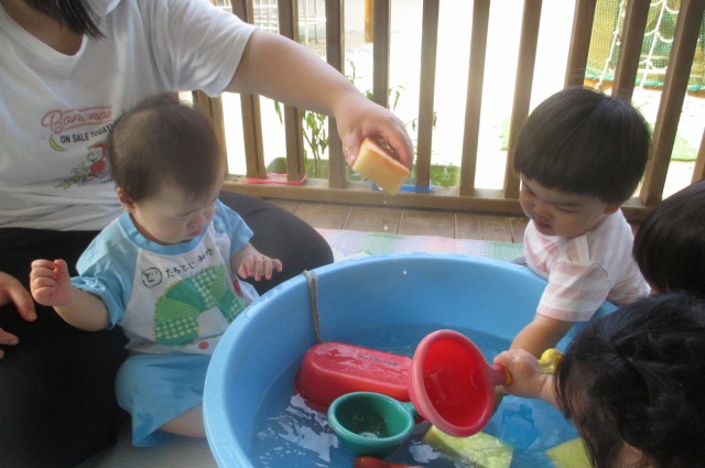 2022年08月31日 久しぶりだね 0歳児 はな 今日は久しぶりに水あそびをしました。 保育者がスポンジを絞って水を出すと、それに手を伸ばしたり、真似して絞ってみたりしていました。 また、スコップで水をすくっては身体にかけるなど、いろいろな遊び方で楽しんでいました。 一覧へ戻る