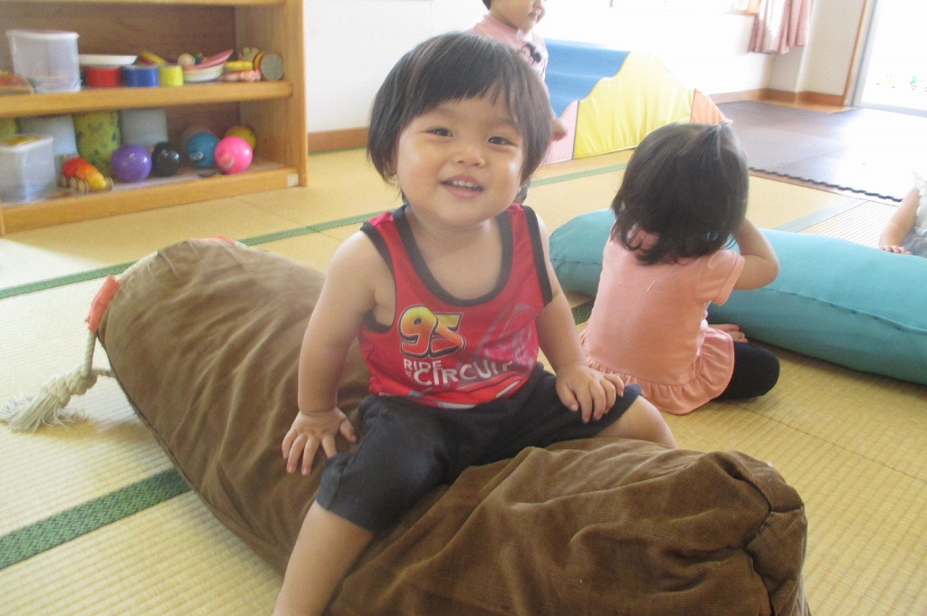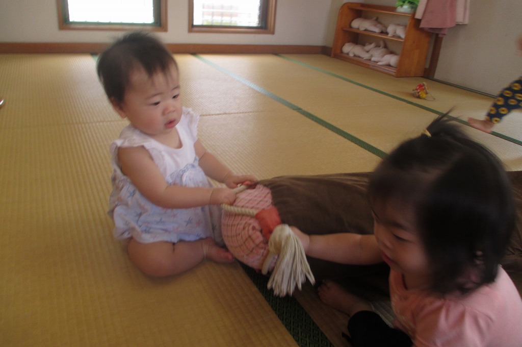 そして、クッションに紐がついているので、それを引っ張ったり、持ったりして楽しんでいました。