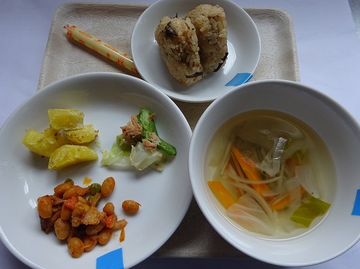 2022年09月06日 給食室(9月6日の給食、おやつ) 給食室 昼食 ・食パン ・ポークビーンズ ・茹でさつま芋 ・ピーマンとツナの和え物 ・ごぼうスープ ・チーズ おやつ ・だしおにぎり おやつの『だしおにぎり』は、新メニューでした。 昆布とかつおでだしをとり、 そのだし汁と醬油でお米を炊きました。 だしをとった後の昆布とかつおを小さく刻んで、 醬油で味をつけて炒めたものを 炊きあがったごはんに混ぜているので無駄がないです。 しっかりだしの風味がし、醬油味で食べやすかったです。 一覧へ戻る