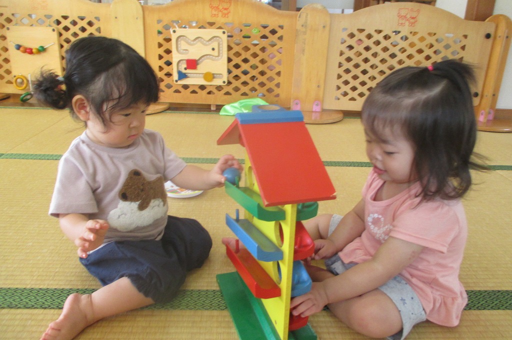 初めて見る玩具に興味を示して近づきます。ボールが転がる姿をじーと眺め、ボールが転がる様子がおもしろかったようで繰り返し楽しんでいました。