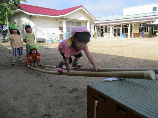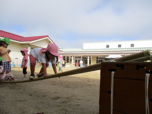 秋の澄み切った空に向かって、こどもたちはよいしょ、よいしょと言わんばかりに慎重に慎重に慎重に棒をつたって登っていきます