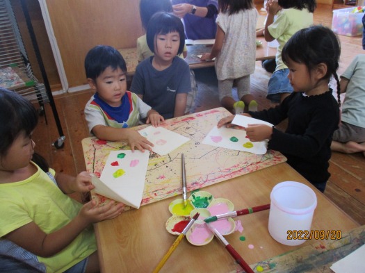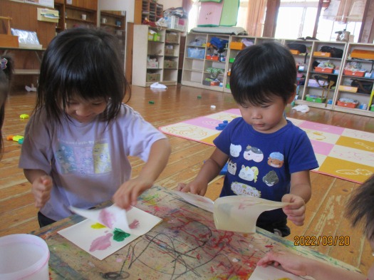 2022年09月21日 摩訶不思議 3歳児 つき 運動会に飾る万国旗づくりならぬ、旗づくりをしました 絵の具でデコルコマニーをしました 紙を合わせるとあら不思議!!その不思議を感じる気持ちが学びの芽生えとなりますね ※インターネットより ↓↓ デカルコマニーとは、絵の具を転写させて作品を作る、シュルレアリスムの絵画でよく使われる絵画技法です。 デカルコマニーは小さな子どもでも簡単にチャレンジできる絵画技法として古くから幼児教育にも取り入れられ、子どもたちの成長の一端を担ってきました。 一覧へ戻る
