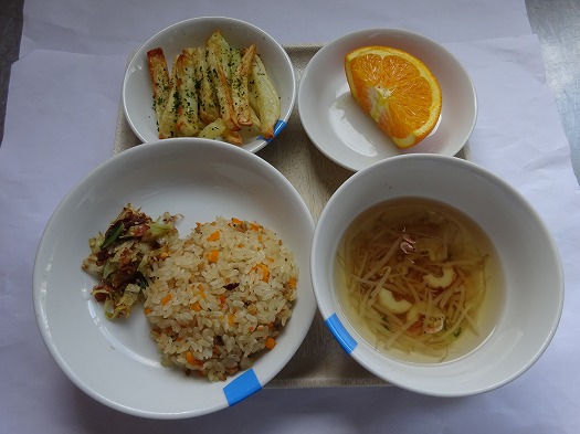 2022年10月07日 給食室(10月6日の給食、おやつ) 給食室 昼食 ・チャーハン ・チンゲン菜と山くらげのナムル ・もやしとあみのスープ ・オレンジ おやつ ・のり塩焼きポテト ・牛乳 園で作る『チャーハン』は、 具材を全て炒めて、 干ししいたけのもどし汁も加え味を付け、 火が通ったら汁と具材に分けて、 汁は米を炊くのに加え、 具は炊きあがったご飯に混ぜ込んで作ります。 卵も炒り卵にして混ぜ込みました。 『チンゲン菜と山くらげのナムル』は、 山くらげのコリコリした食感がアクセントになって美味しいです。 一覧へ戻る
