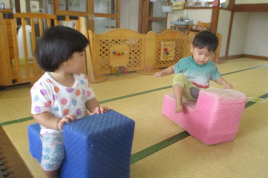 保育者が「バスに乗って揺られてるごーごー」とうたを歌いながら手でハンドルを動かしている真似をすると、こどもたちも真似します。バスに乗っている気分ですね。