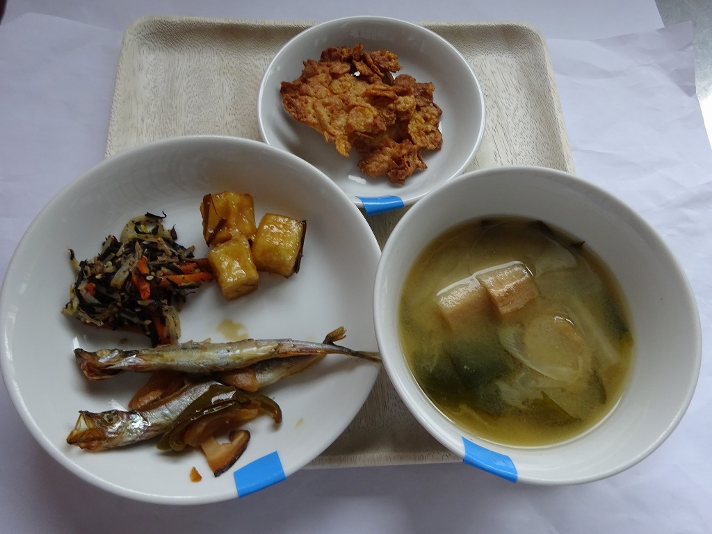 2022年10月12日 給食室(10月12日の給食、おやつ) 給食室 昼食 ・ごはん ・ししゃもの南蛮漬け ・高野豆腐のオランダ煮 ・ひじきの三色和え ・大根のみそ汁 おやつ ・コーンフレーククッキー ・牛乳 『ししゃもの南蛮漬け』は、 焼いたししゃもに、 野菜を入れて作った甘酢をかけました。 『高野豆腐のオランダ煮』は、 水につけて戻した高野豆腐の水をしぼり、 適当な大きさに切り、片栗粉をまぶして油で揚げ、 作っておいた甘辛のだしの中に入れて少し煮込んだ物です。 おやつの『コーンフレーククッキー』は、 久しぶりでしたが、やっぱり人気です。 一覧へ戻る