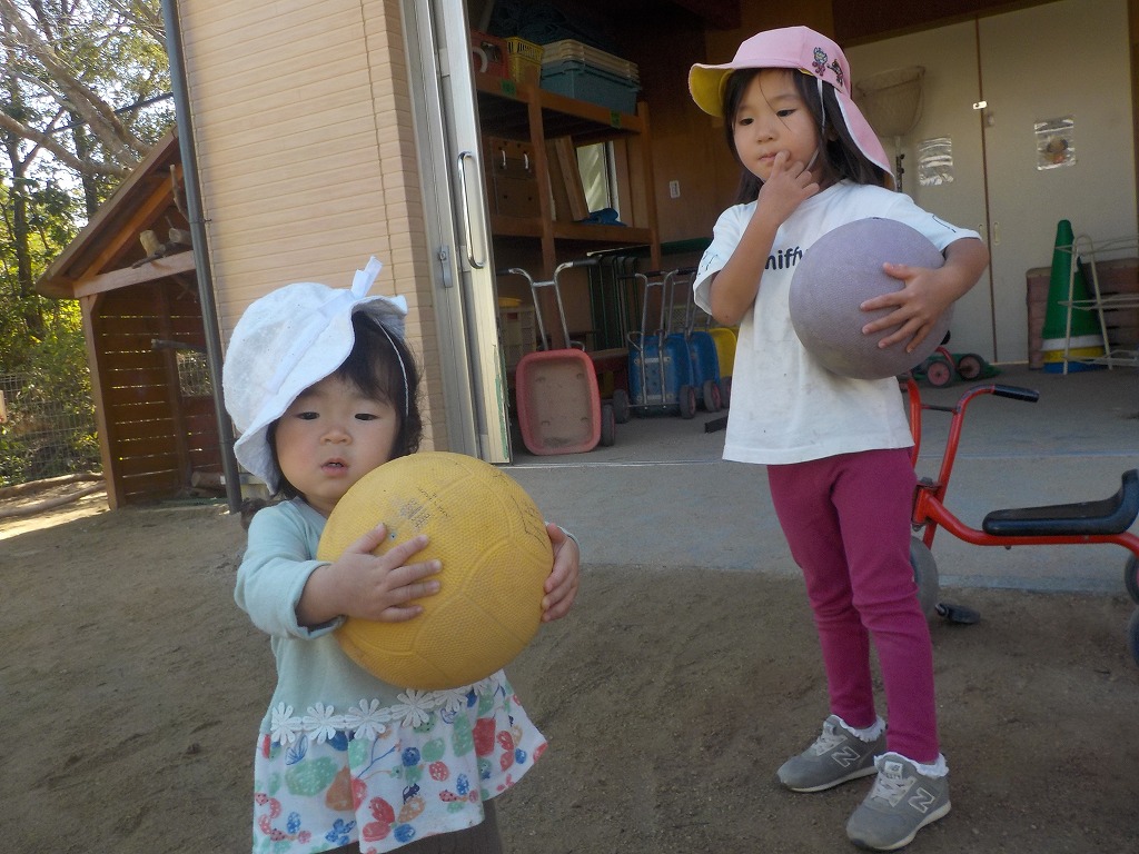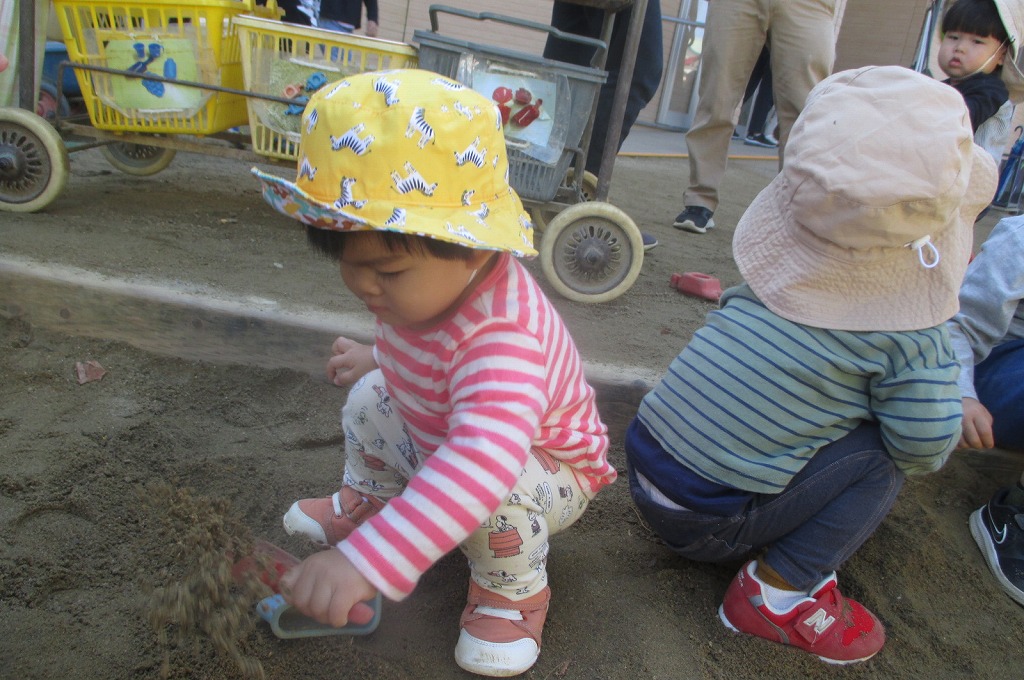 2022年10月14日 外へ行こう 0歳児 はな 靴を履いて外に行きました。靴を履くことが嬉しいはな組。 砂場でスコップや型を持って砂をすくったり、ボールを転がしたり。 広い園庭では端から端まで歩きます。 一覧へ戻る