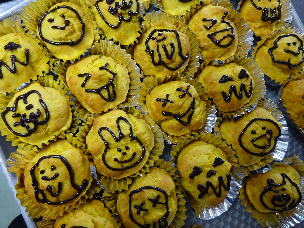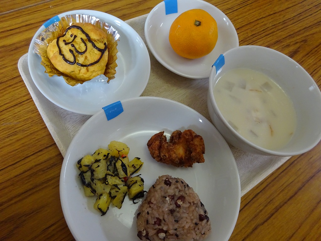 2022年10月28日 給食室(10月27日の給食、おやつ) 給食室 昼食 ・赤飯 ・鶏肉の塩麹唐揚げ ・さつま芋の彩りサラダ ・根菜入り豆乳味噌スープ ・みかん おやつ ・ハロウィンカップケーキ ・牛乳 27日は誕生会メニューでした。 10月生まれの皆さん、おめでとうございます。 『ハロウィンカップケーキ』の生地にはかぼちゃが入っています。 ココアアイシングでハロウィンにちなんだイラストを描きました(中には関係のないキャラクターも潜んでいますが) 「どれを食べよう!」とニコニコ笑顔で悩んでいるこどもたちでした。 一覧へ戻る