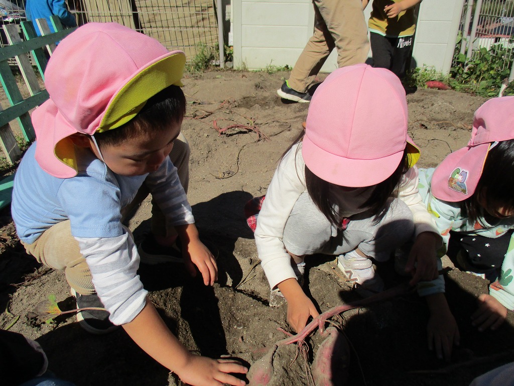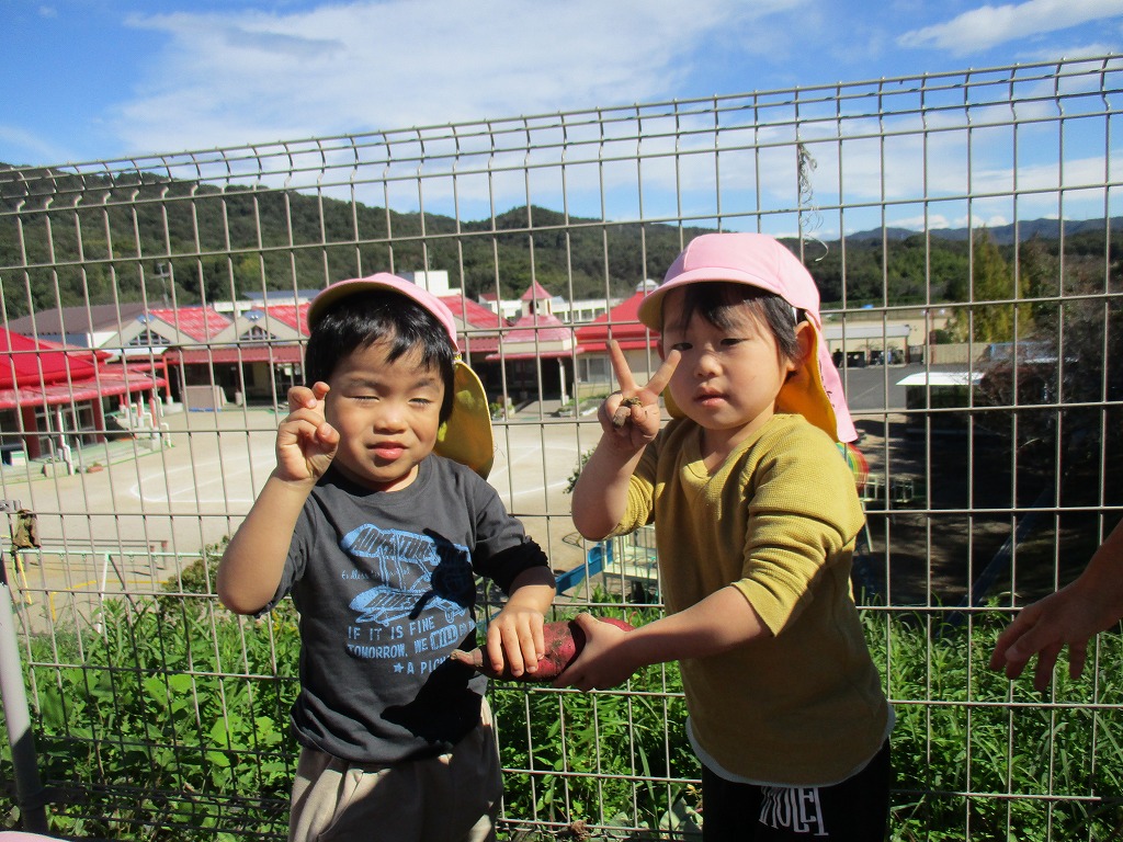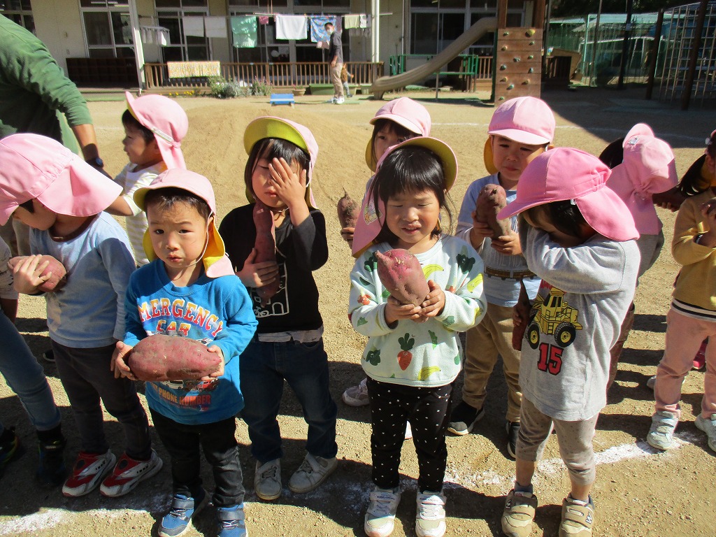 2022年10月31日 ほり掘るほり掘る 3歳児 つき さつまいも畑のさつまいもを収穫しました 掘る前に、部屋でパネルシアターを見て、いざ畑へ出発 ※ちなみにパネルシアターは、ほし組の宮本のお得意ネタです 掘る、抜くのではなく掘るということをくり返し伝える事で、さつまいもを掘って収穫することができました ポキッとさつまいもが折れることもあまりなかったです 一覧へ戻る