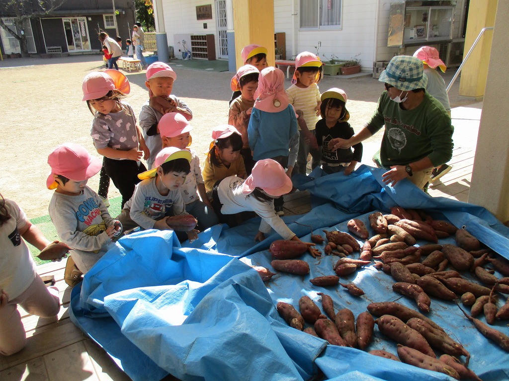 収穫したさつまいもをブルーシートに置くぞ~