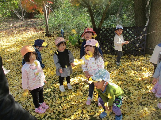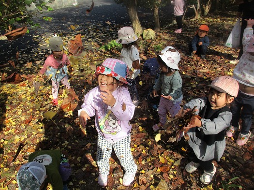 お決まりの落ち葉シャワーやドングリ拾いをし、楽しみました。