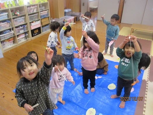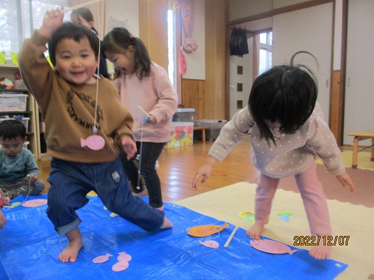 2022年12月07日 魚釣り 2歳児 にじ 自分たちで作った魚を、部屋に持ち帰って釣りをしました。 竿を上手く欲しい魚に当てて釣っていきます。 釣れると、「みてみてー」ととても嬉しそうです。 一覧へ戻る