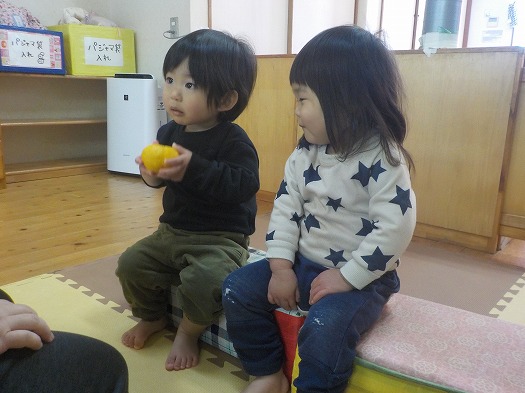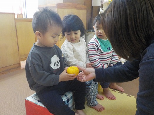 2022年12月26日 いいにおいだね 1歳児 ゆき 22日は冬至ということで、ゆずを触ったりゆずの匂いを嗅いだりしました。 ゆずをこどもたちに見せると、「みかん」「かぼちゃ」と言っており、「これはゆずだよ」と声をかけると、ゆずを見ながら「ゆず」と言っていました。 どんなにおいかな?どんな触り心地かな?実際に触れて楽しみました。 一覧へ戻る