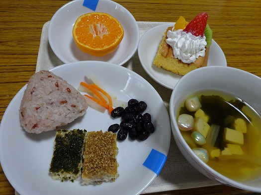おやつはキウイ、もも缶、ホイップクリームが乗った、カラフルな『いちごのフルーツケーキ』でした。