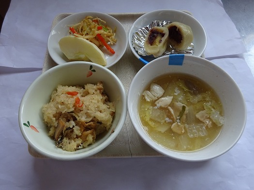 2023年01月27日 給食室(1月26日の給食、おやつ) 給食室 昼食 ・いりこ飯 ・キャベツとさきいかの和え物 ・豚汁 ・りんご おやつ ・いきなり団子 ・牛乳 『いりこ飯』は、香川県の郷土料理で、 炊き込みご飯に煮干しが入っています。 おやつは、熊本県の郷土料理、 『いきなり団子』でした。 白玉粉、薄力粉、サラダ油、を練って作った生地に さつま芋とあんこを包んで蒸しました。 一覧へ戻る