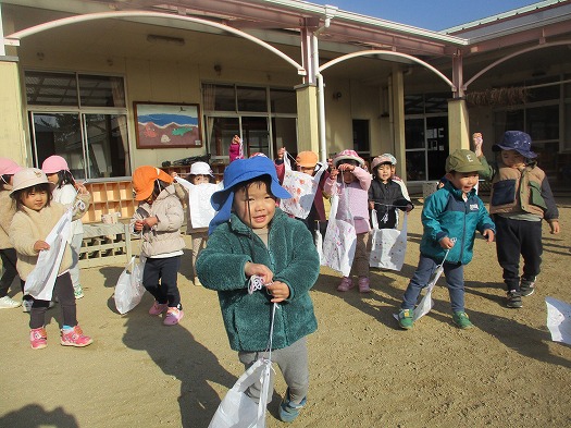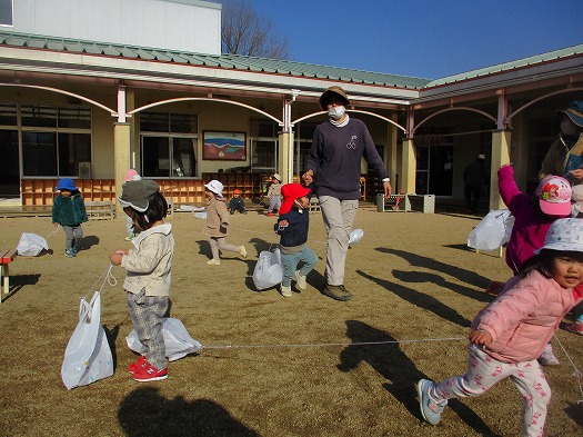 2023年01月06日 たこあげ 2歳児 にじ 製作した、凧を園庭であげました。 走ると、少し高く舞い上がることが分かると、 友だちと競争するように、笑い合いながら凧あげを楽しんでいました。 一覧へ戻る