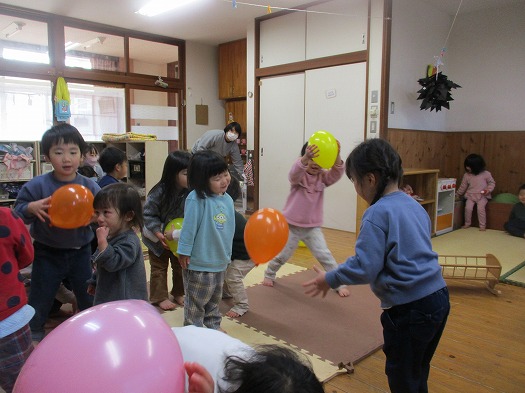 風船を膨らましていると「ピンクがいい」「あおがいい」などと自分の好きな色が欲しいと伝えていましたが、「みんなで使おうね」と声を掛けると友だちと譲り合いながら使う姿が見られました。