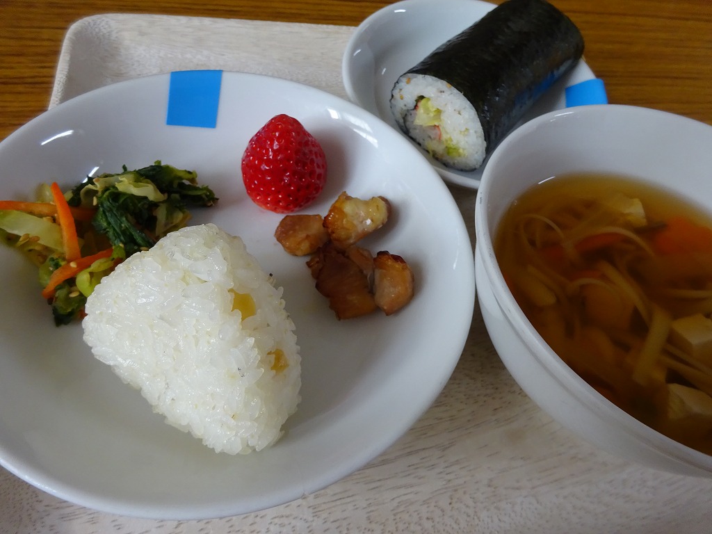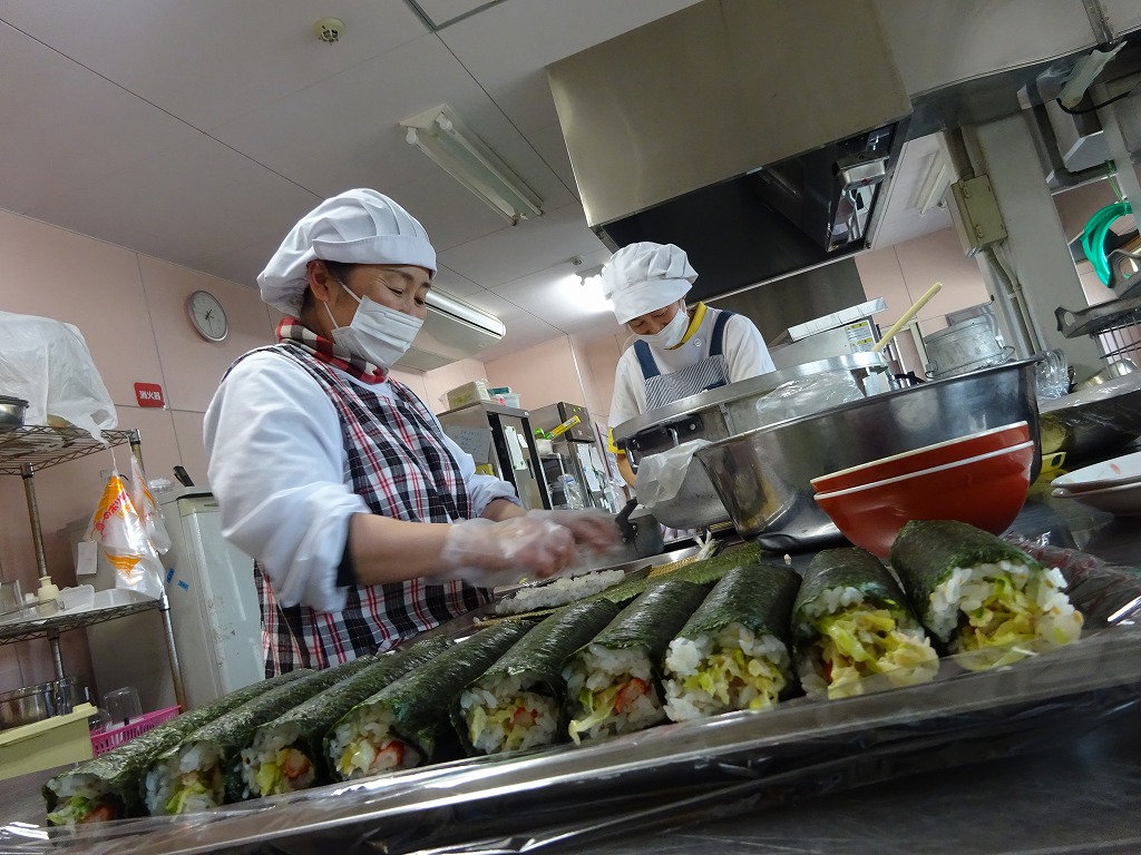 給食室はてんやわんやになりながら、ひとつひとつ丁寧に巻いています。