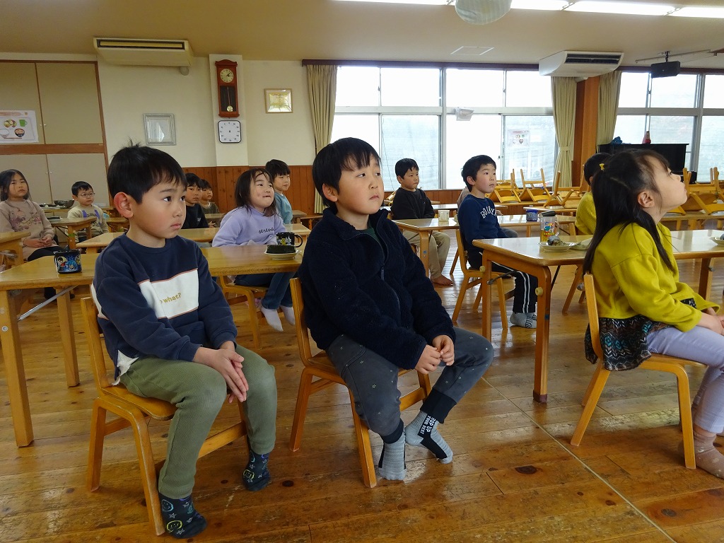 恵方巻きの食べ方を真剣に聞くこどもたちでした。