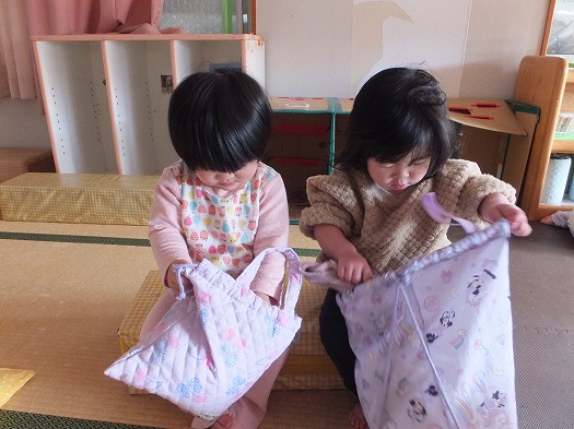 「このパジャマ袋誰のかな?」と聞くと、自分のパジャマ袋を取りに来ます。保育者がパジャマ袋を開けると自分で服やズボン、紙パンツを取っています。